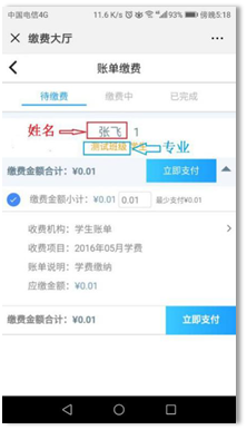 4.登錄進入繳費平台後,點擊“賬單繳費”,請核對姓名、專業信息無誤後再進行繳費。也可以點擊右下角“我的”查看姓名。